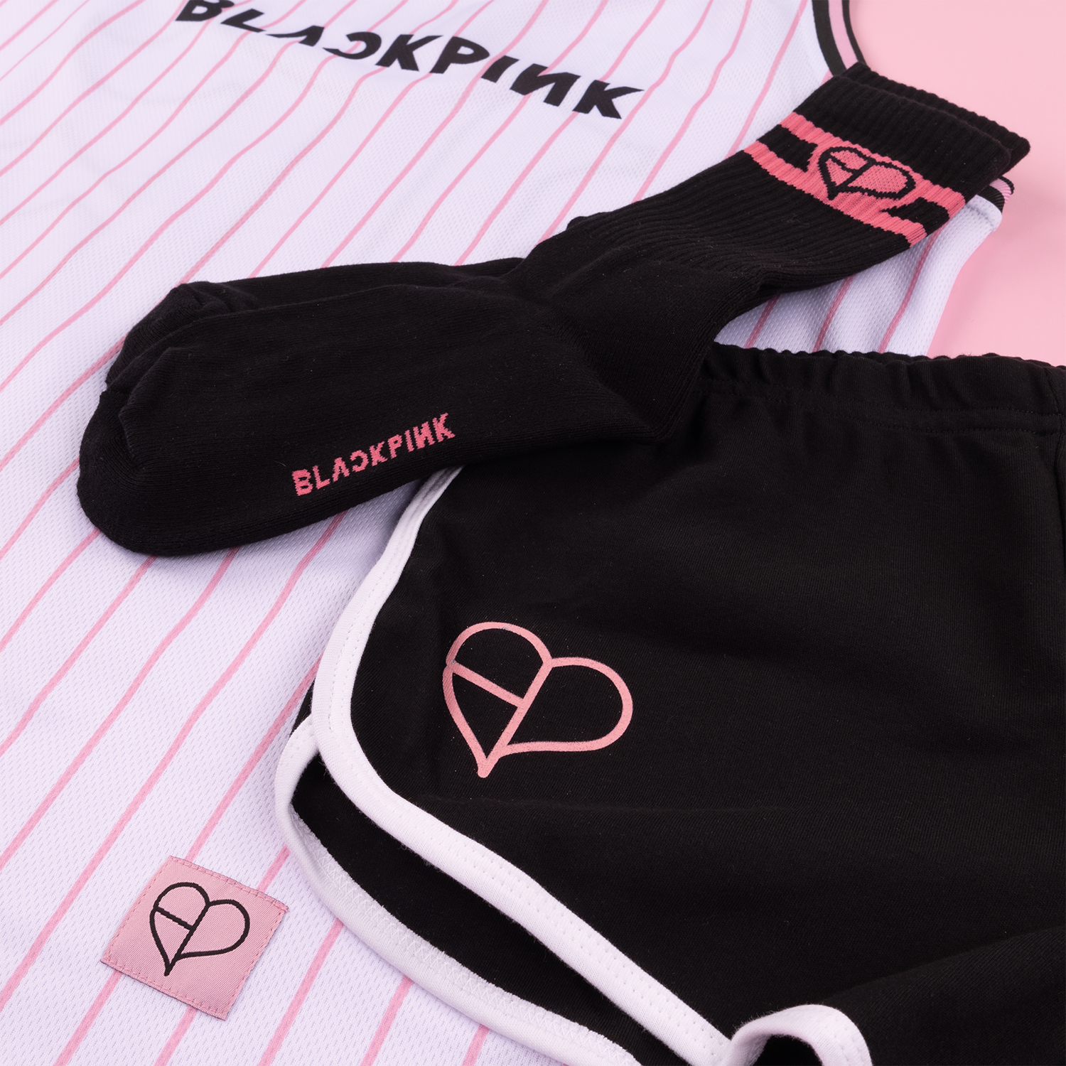 Custom white pinstripe basketball jersey with BLACKPINK on the front and DEADLINE 16 on the back.